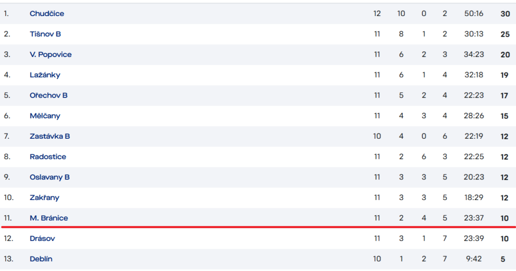 Úvod Následující kolo: Muži 9.Liga Sk.B 1. kolo: sobota 1.11.2025 v 14:00 hod.Mor. Bránice – Oslavany “B”. Starší příprava11. kolo: 1.11.2025 v 10:45 hod.Mor. Bránice – Kahan “B”. Aktuální výsledky: 13.kolo: 9.liga dospělí Sk. B: Ořechov “B” – Mor. Bránice 4 : 1 .Branky: Hron Adam. 11. kolo: skupina C starší přípravka:Kahan “A” – Mor. Bránice 25 : 3. Branky: Brustmannová J. 2x, Nemec V. Tabulka 9. liga dospělí Sk. B 2025/26