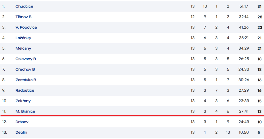 Úvod Následující kolo: Muži 9.Liga Sk.B 17. kolo: 28.3.2026 v 15:00 hod.Radostice – Mor. Bránice. Starší příprava12. kolo: 5.4.2026 v 9:00 hod.Kahan “B” – Mor. Bránice. Aktuální výsledky: 16.kolo: 9.liga dospělí Sk. B: Mor. Bránice – Deblín 3 : 0.Branky: Mulenga 2x, Hron Štěpán. 12. kolo: skupina C starší přípravka:Kahan “B” – Mor. Bránice – : -. Branky: Tabulka 9. liga dospělí Sk. B 2025/26