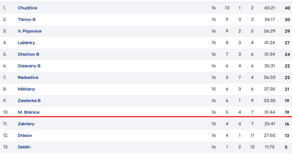 Úvod Následující kolo: Muži 9.Liga Sk.B 20. kolo: 19.4.2026 v 16:00 hod. Mor. Bránice – Chudčice. Starší příprava14. kolo: pátek 17.4.2026 v 17:00 hod.Popůvky – Mor. Bránice. Aktuální výsledky: 19.kolo: 9.liga dospělí Sk. B: Drásov – Mor. Bránice 0 : 1 .Branka: Mulenga Takanatswa Moses. 12. kolo: skupina C starší přípravka:Kahan “B” – Mor. Bránice 12 : 1. Tabulka 9. liga dospělí Sk. B 2025/26